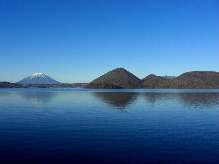観光 洞爺湖と羊蹄山 洞爺湖から見る残雪の羊蹄山 何年か前に撮影した写真。洞爺湖から見える羊蹄山の頂上にはまだ雪が残っている。季節は6月頃か。波も少なく穏やか。別のところから見ると羊蹄山の位置も違って見える。 2023.08.16 観光